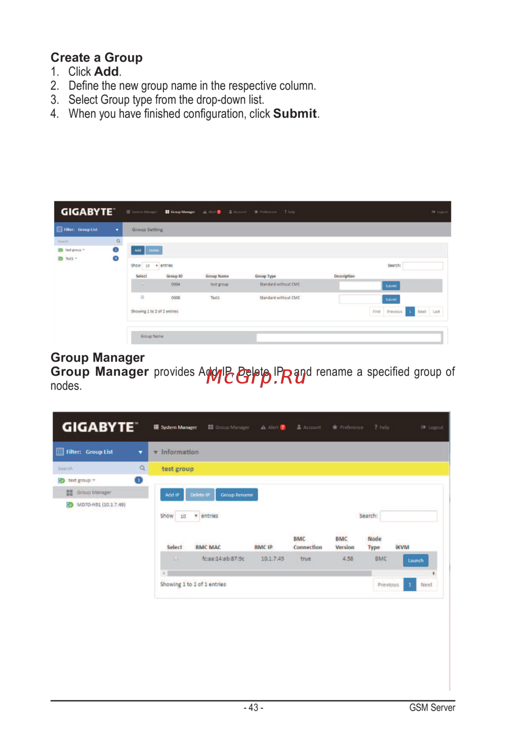 Group Manager provides Add IP, Delete IP, and rename a specified group of