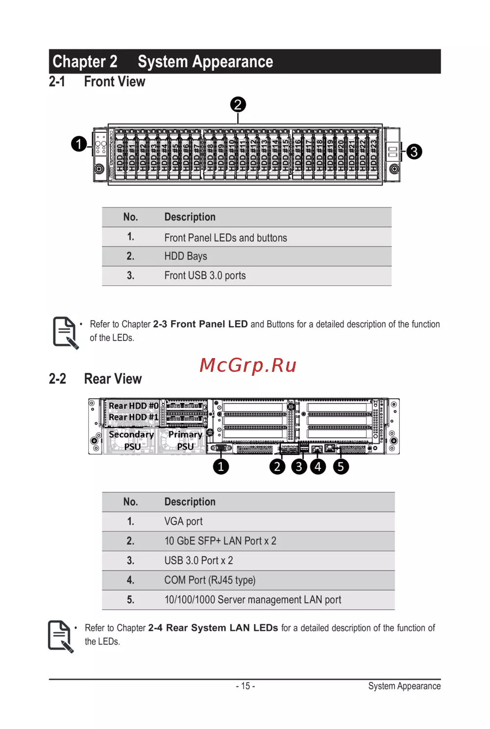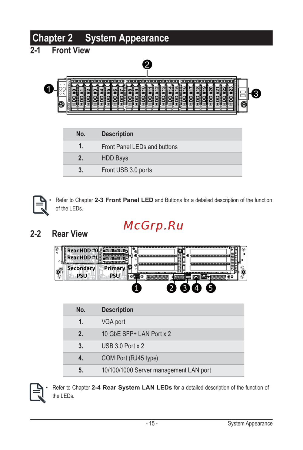 • Refer to Chapter 2-4 Rear System LAN LEDs for a detailed description of the function of