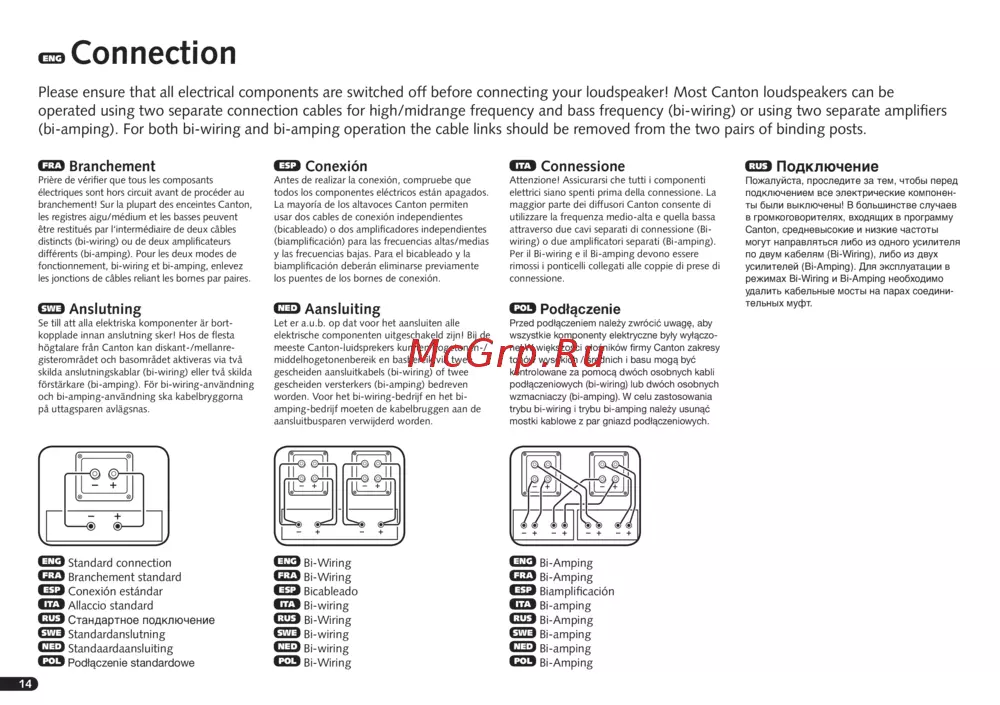 - Please ensure that all electrical components are switched off before connecting your loudspeaker most canton loudspeakers can be operated using two separate connection cables for high midrange frequency and bass frequency bi wiring or using two separate amplifiers bi amping for both bi wiring and bi amping operation the cable links should be removed from the two pairs of binding posts p.14
