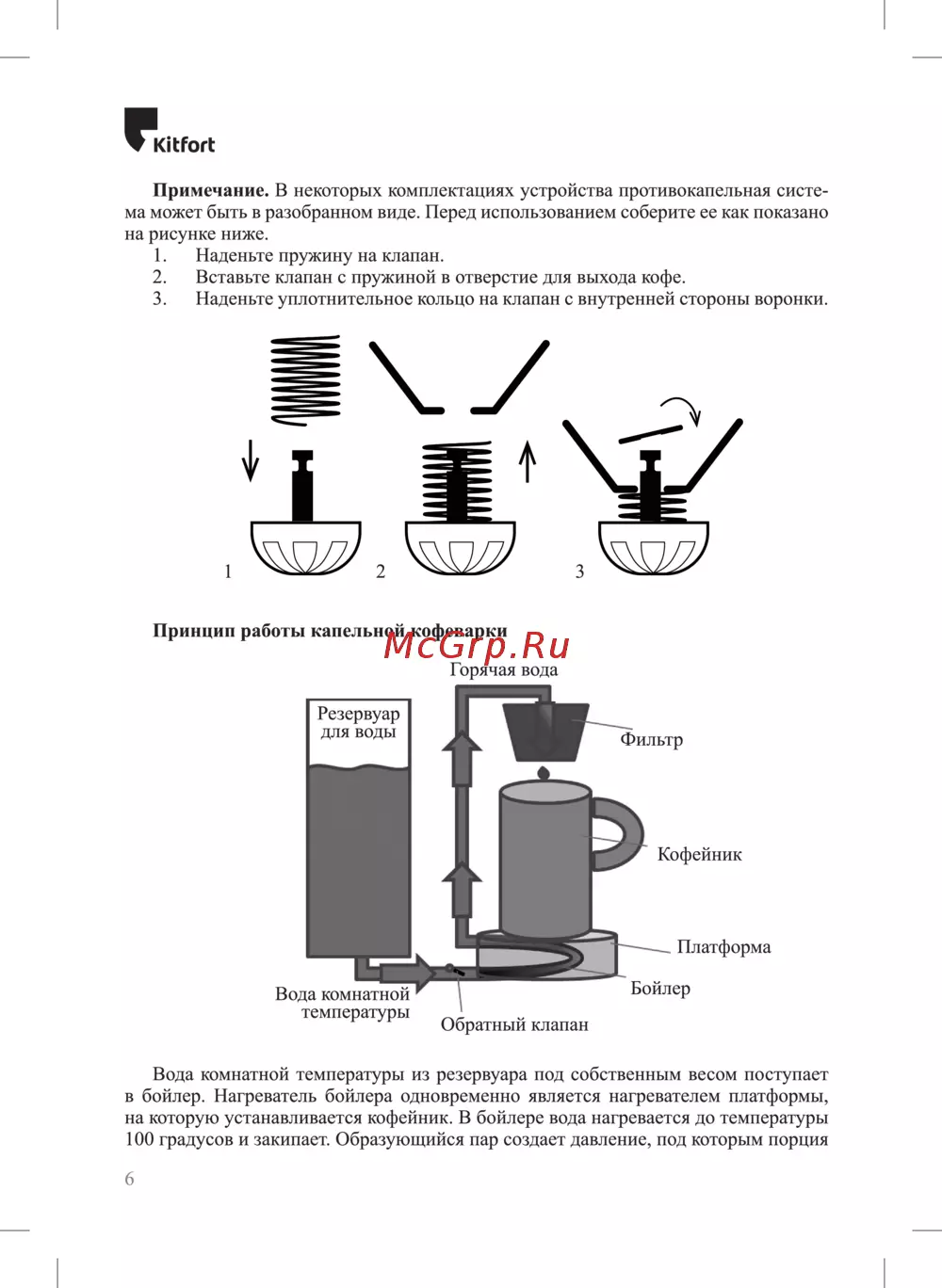 - Ника приподнимает клапан вместе с клапаном поднимается уплотнительное кольцо внутри воронки и открывает отверстие для выхода кофе когда вы вынимаете кофей ник пружина выталкивает клапан вниз и уплотнительное кольцо плотно закрывает отверстие для выхода кофе таким образом когда вы вынимаете кофейник подача кофе приостанавливается а когда устанавливаете кофейник обратно подача кофе возобновляется p.5