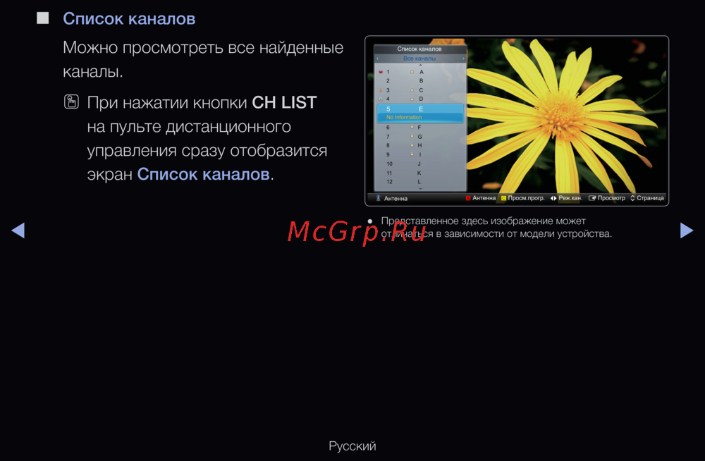 - При нажатии кнопки ch list на пульте дистанционного управления сразу отобразится экран список каналов p.10