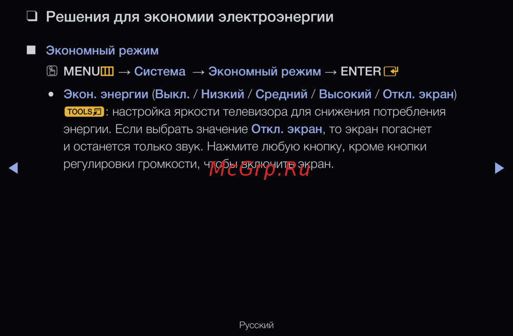 энергии. Если выбрать значение Откл. экран, то экран погаснет