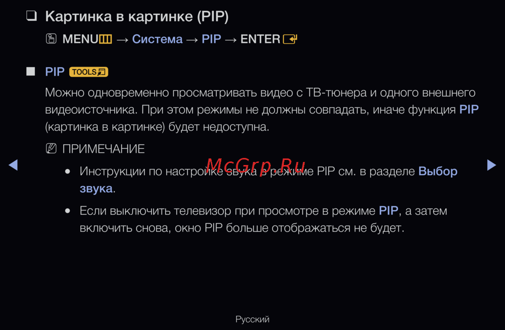 Инструкции по настройке звука в режиме PIP см. в разделе Выбор
