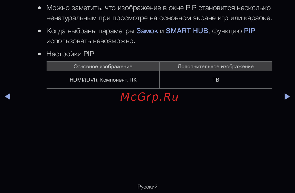 Когда выбраны параметры Замок и SMART HUB, функцию PIP