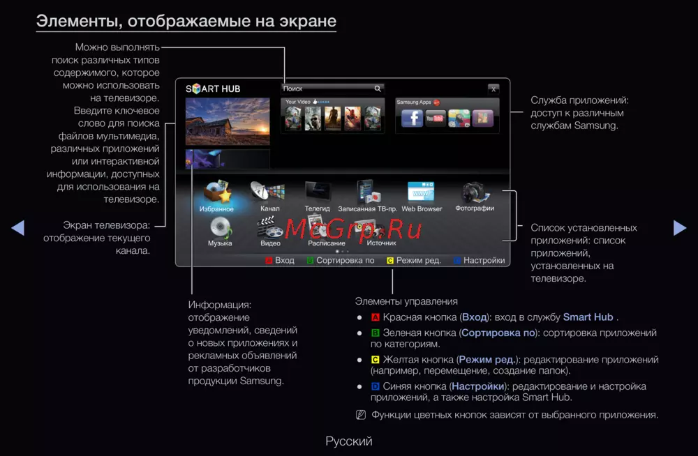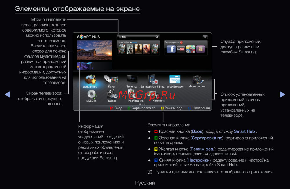 Узнайте о функциях управления телевизором, включая доступ к приложениям, сортировку и настройки. Оптимизируйте использование Smart Hub для комфортного просмотра.