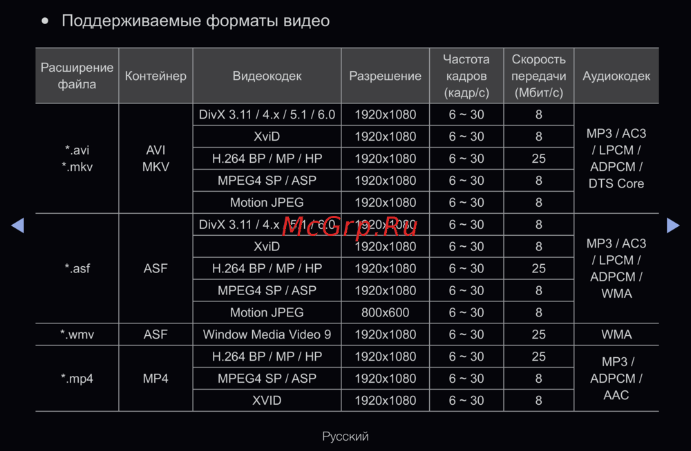 - Поддерживаемые форматы видео p.248
