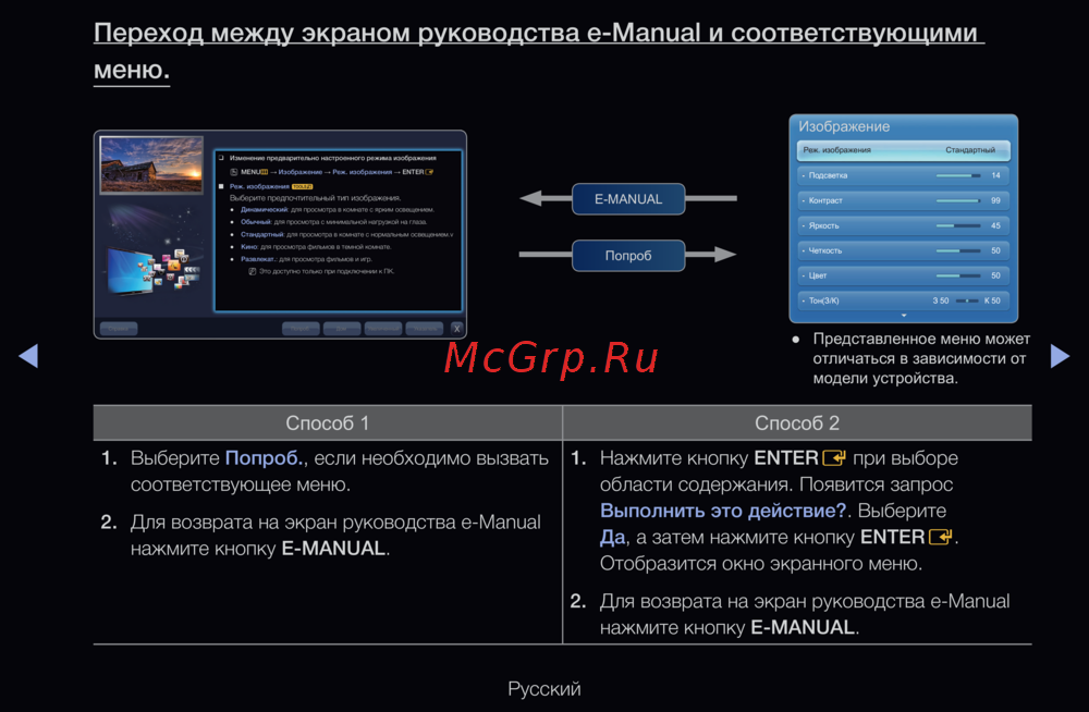 Samsung UE-46 D6100SW [313/318] Переход между экраном руководства e manual и соответствующими меню