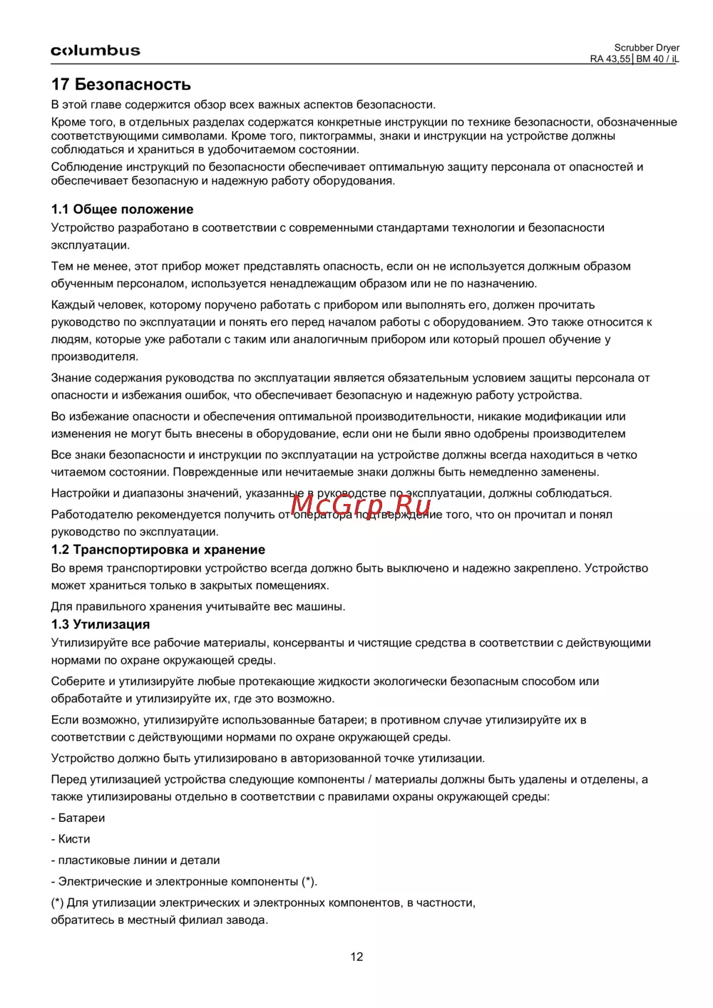 Columbus RA 55 BM 40iL — обзор безопасности и инструкции по эксплуатации оборудования [3/26]
