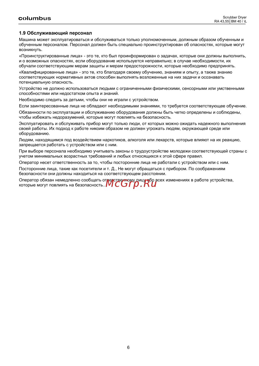 Columbus RA 55 BM 40iL — обязанности и требования к обслуживающему персоналу оборудования [6/26]