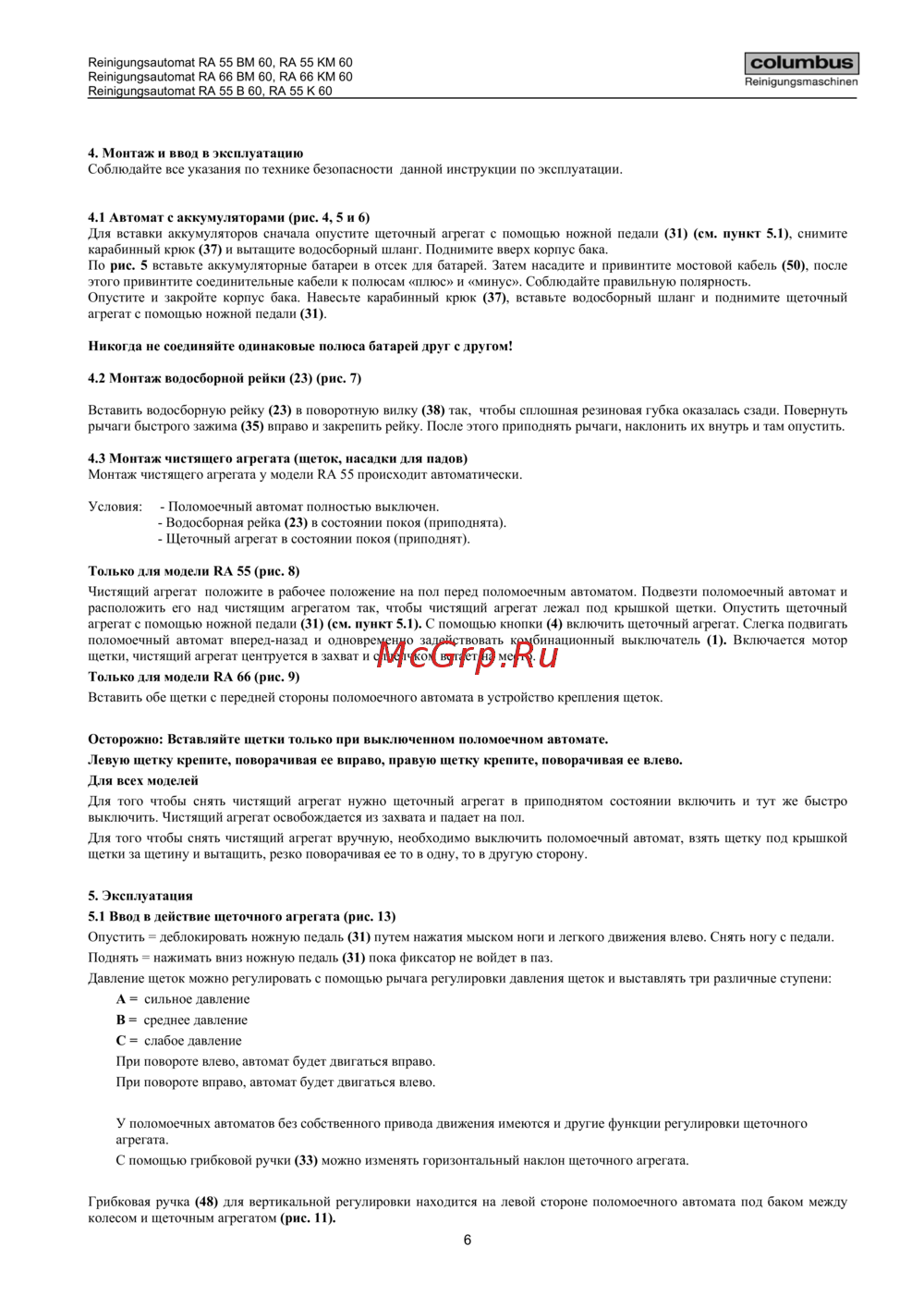 Columbus RA 55 B 60 — инструкция по эксплуатации поломоечных автоматов: монтаж и использование [7/17]