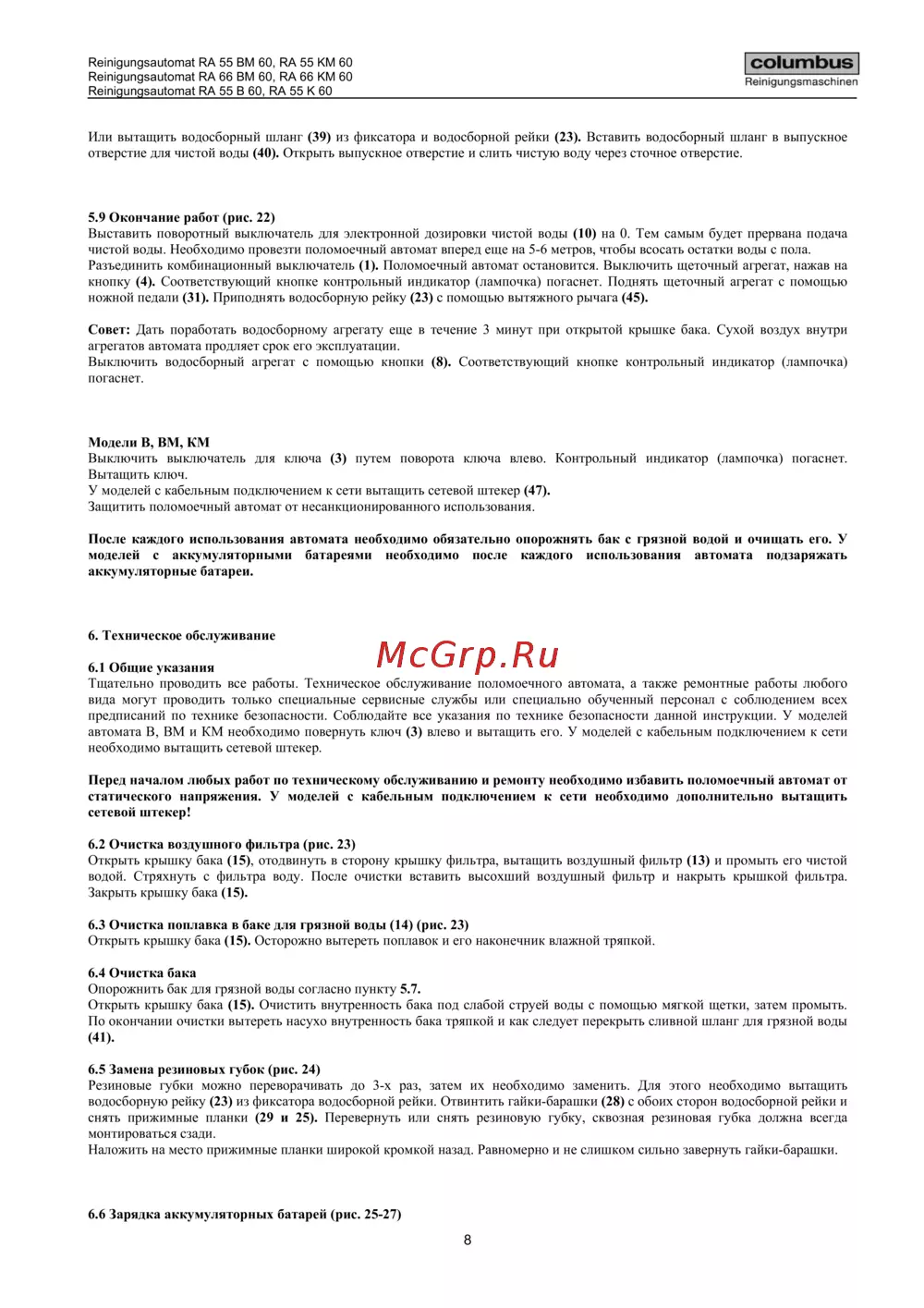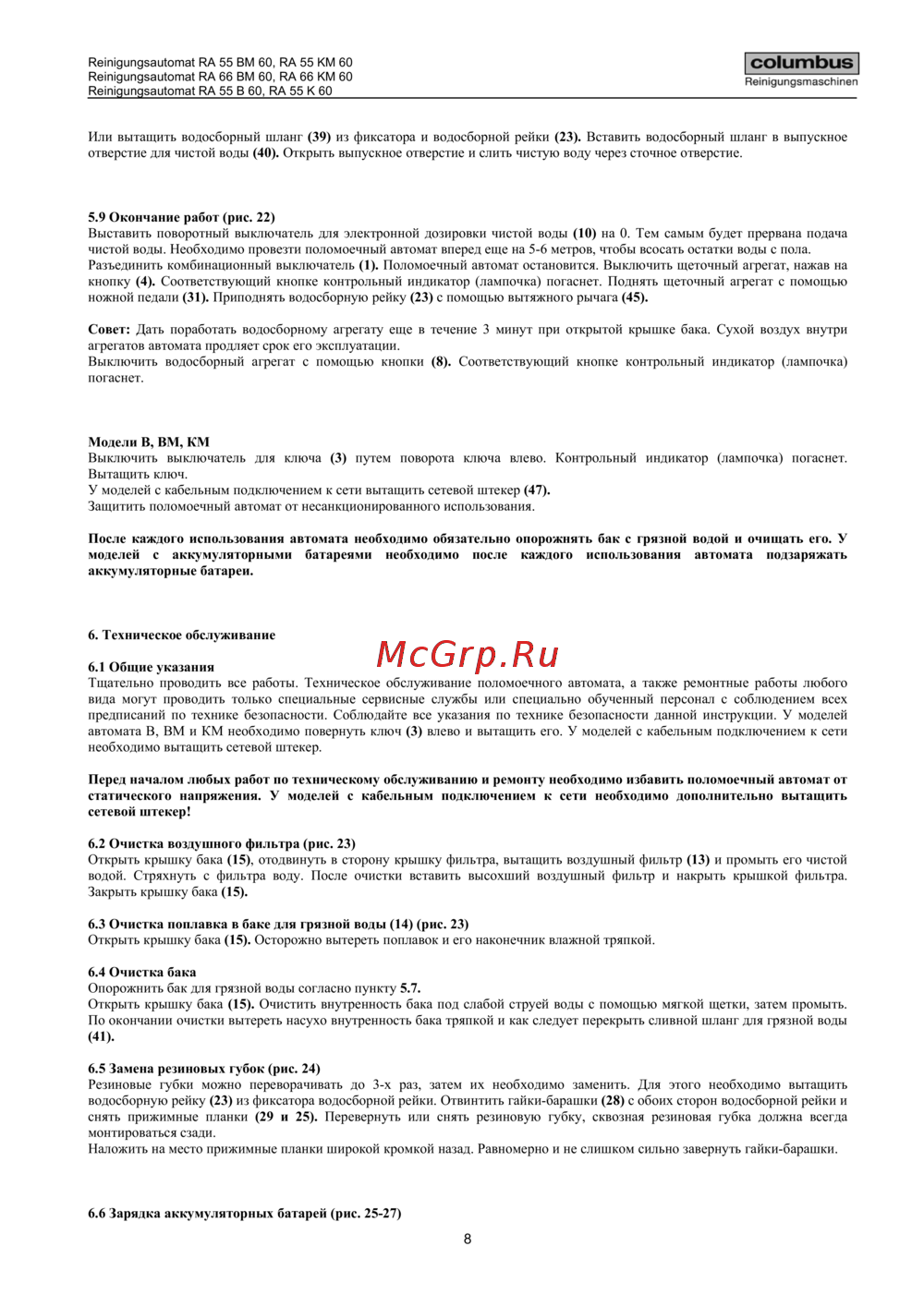 Columbus RA 55 B 60 — инструкция по эксплуатации поломоечного автомата: советы и рекомендации [9/17]