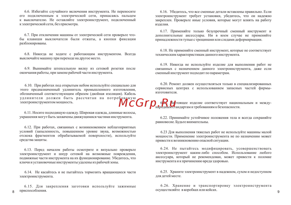6 6 Избегайте случайного включения инструмента Не переносите его подключенным к электрической сети прикасаясь пальцем к выключателю Не оставляйте электроинструмент подключенный к электрической сети без присмотра 6 7 При отключении машины от электрической сети проверьте что бы клавиши выключателя были отжаты а кнопки фиксации разблокированы 6 8 Никогда не ходите с работающим инструментом выключайте машину при переходе на другое место 6 9 Вынимайте штепсельную вилку из сетевой окончания работы при замене рабочей части инструмента розетки 6 16 Убедитесь что все сменные детали вставлены правильно Если электроинструмент требует установки убедитесь что он надежно закреплен Проверьте иные условия которые могут влиять на работу изделия 6 17 Применяйте только безупречный сменный инструмент и дополнительные аксессуары Ни в коем случае не применяйте принадлежности тупые с трещинами или следами деформирмации Всегда 6 18 Не применяйте сменный инструмент которые не соответствует техническим характеристикам данного инструмента после 6 19 Никогда не используйте изделие для выполнения работ не связанных с назначением данного электроинструмента даже если сменный инструмент подходит по параметрам 6 10 При работах под открытым небом используйте специально для этого предназначенный удлинитель промышленного изготовления обозначенный соответствующим образом двойная изоляция Кабель удлинителя должен быть рассчитан на потребляемую электроинструментом мощность 6 11 Носите подходящую одежду Широкая одежда длинные волосы украшения могут быть захвачены движущимися частями инструмента 6 20 Ремонт должен осуществляться только в специализированных сервисных центрах с использованием запасных частей фирмыизготовителя 6 21 Настоящее изделие соответствует национальным и между народным стандартам и требованиям к безопасности 6 22 Принимайте устойчивое положения тела и всегда сохраняйте равновесие Будьте внимательны 6 12 При работах связанных с возникновением неблагоприятных условий запыленность повышенном уровне звука возможностью отскока фрагментов обрабатываемой поверхности используйте средства защиты 6 23 Для выполнения тяжелых работ не используйте машины малой мощности Применение электроинструмента не по назначению может привести к возникновению опасной ситуации 6 13 Перед началом работы осмотрите и визуально проверьте электроинструмент и шнур сетевой на возможные повреждения подвижные части инструмента на их функционирование Убедитесь что ключи и установочные инструменты удалены из рабочей зоны 6 24 Не пытайтесь модифицировать усовершенствовать электроинструмент каким либо способом Использование любого аксессуара который не рекомендован может привести к поломке инструмента и к причинению вреда здоровью 6 14 Не касайтесь и не пытайтесь тормозить вращающиеся части электроинструмента 6 25 Храните электроинструмент в надежном сухом и недоступном для детей месте 6 15 Для приспособления 6 26 Хранение и транспортировку осуществляйте в коробках или кейсах закрепления заготовки используйте зажимные электроинструмента
