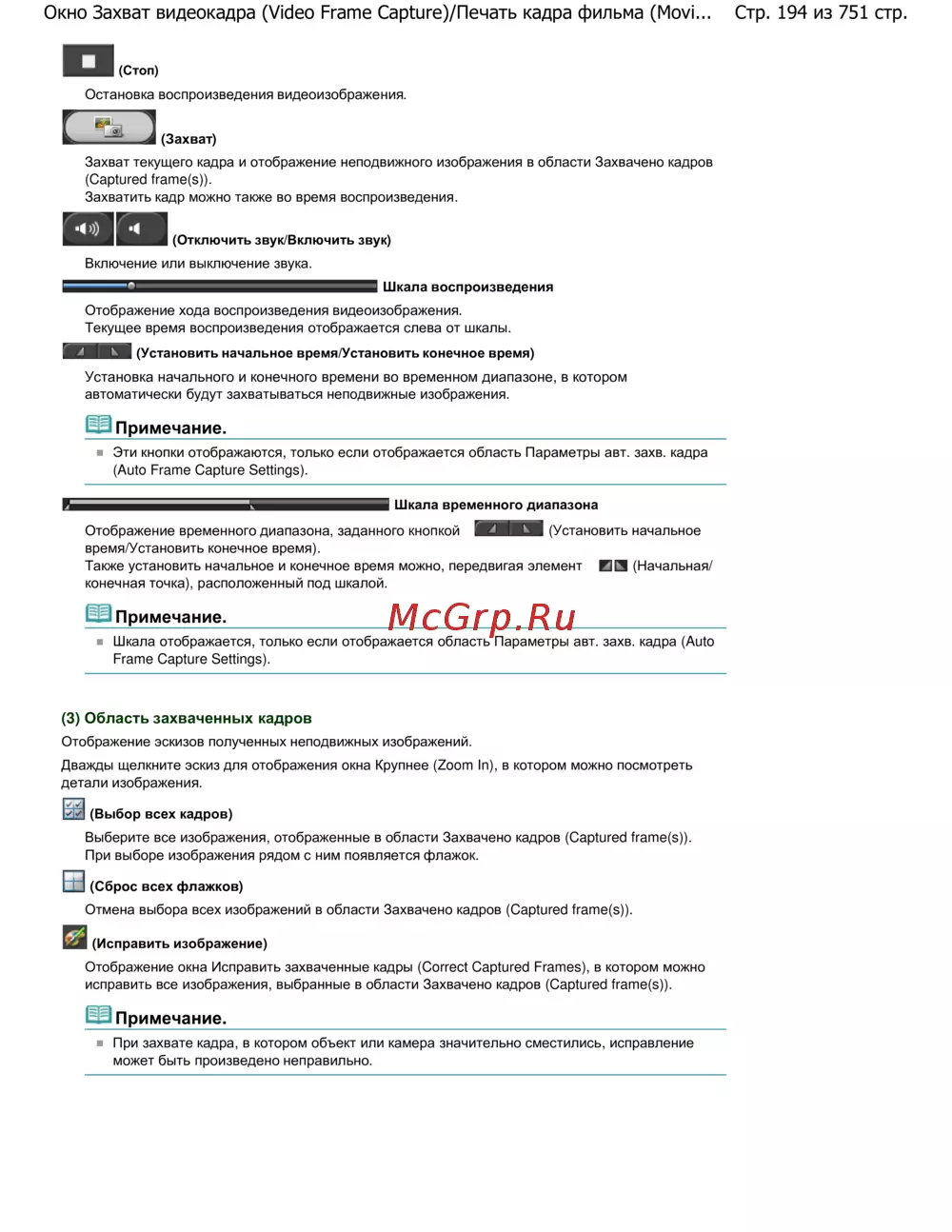 Стр. 194 из 751 стр.Окно Захват видеокадра (Video Frame Capture)/Печать кадра фильма (Movi...