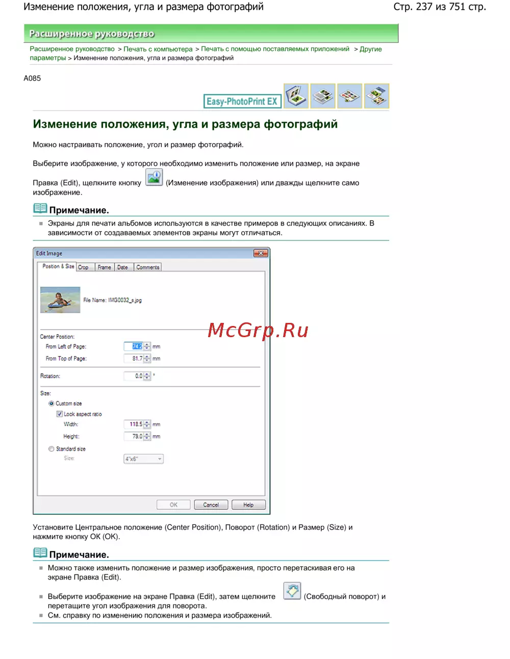 Canon Pixma MP280 — как изменить положение, угол и размер фотографий для печати [237/751]