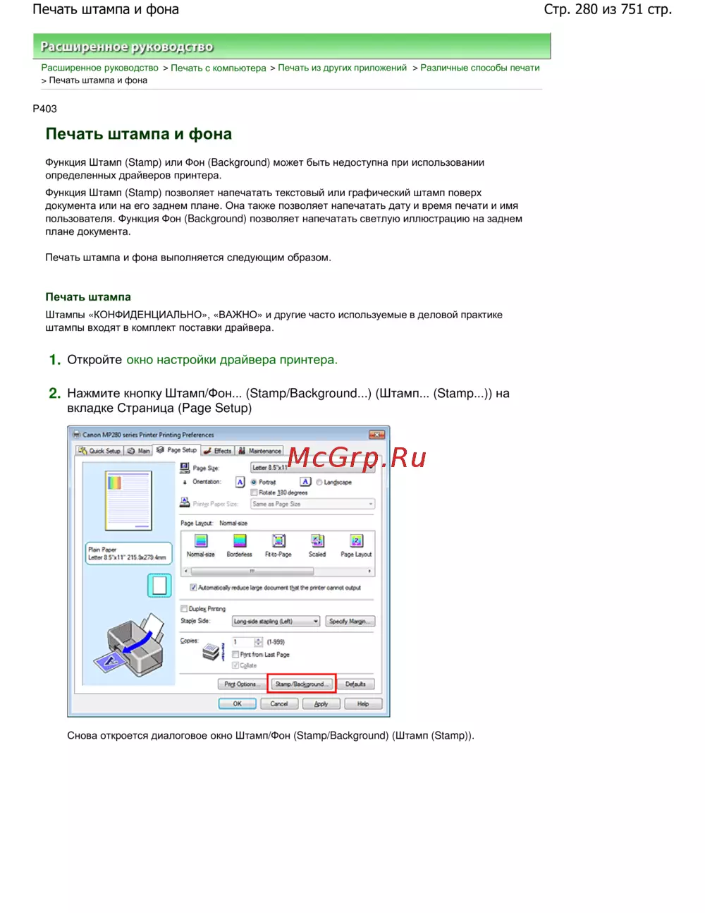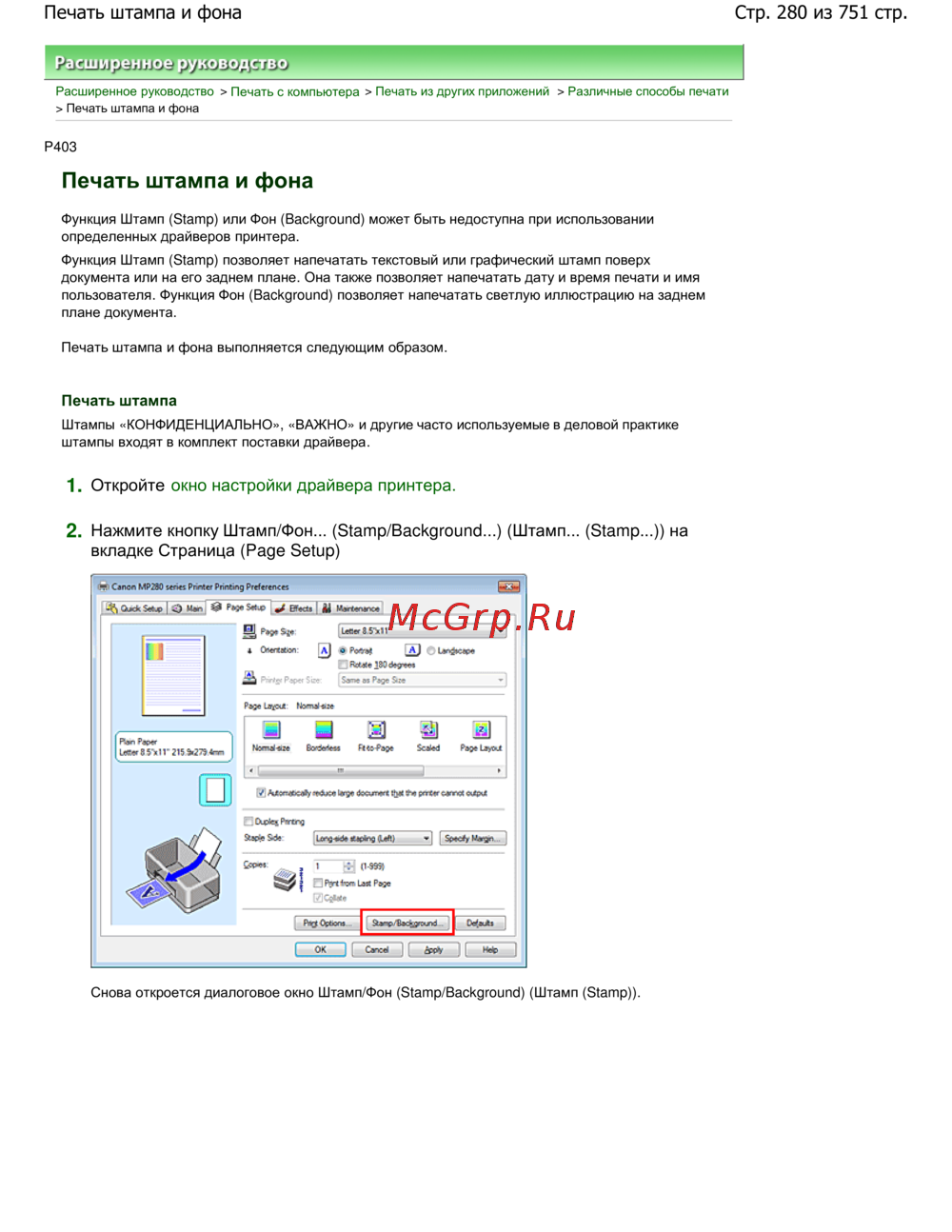 Canon Pixma MP280 — как печатать штампы и фоновые изображения с компьютера [280/751]