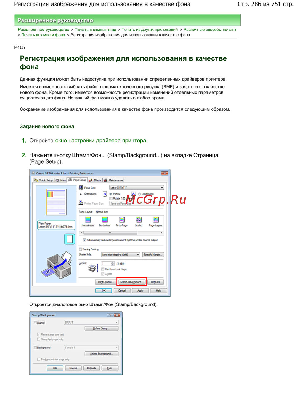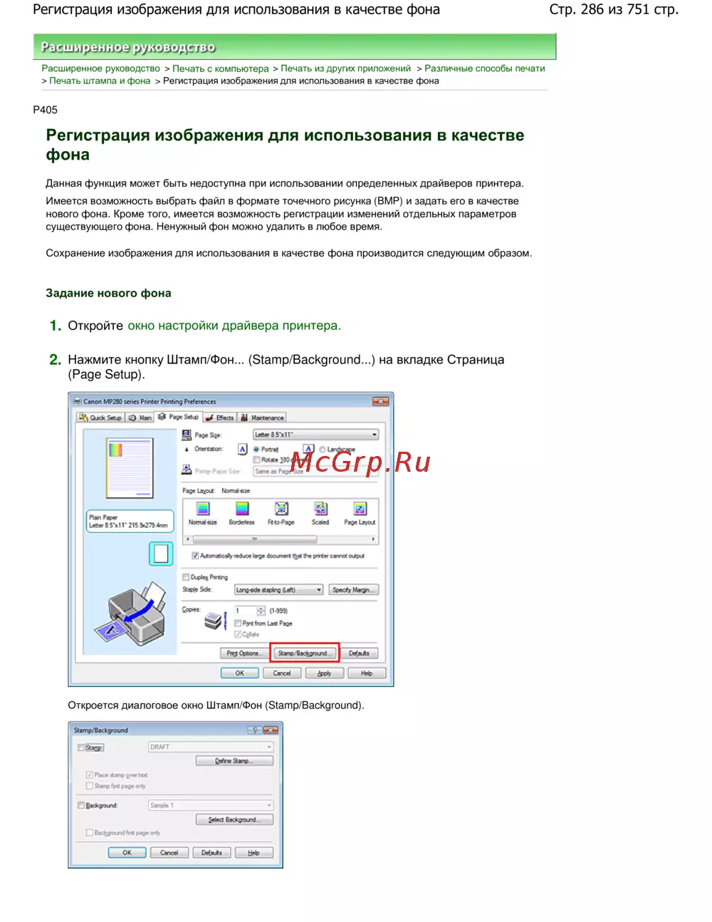 Canon Pixma MP280 — как зарегистрировать изображение для фона при печати [286/751]