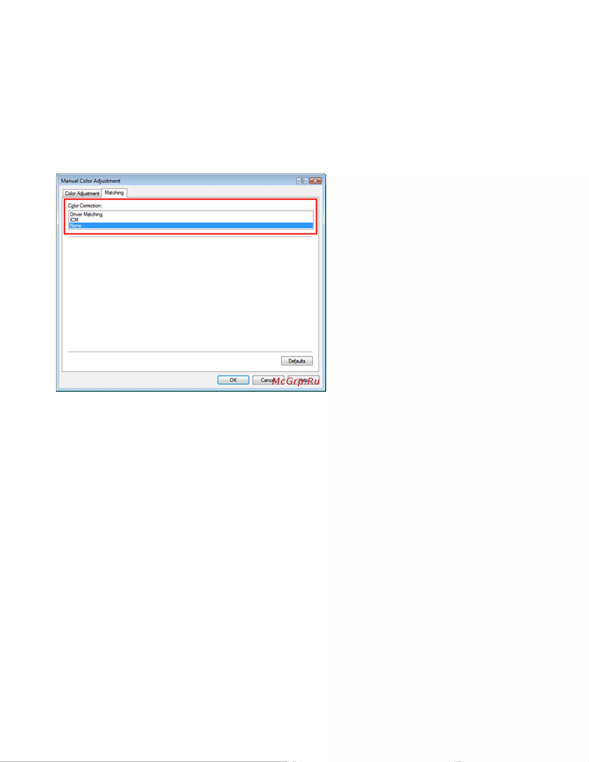 Когда печать выполняется из приложения, которое не позволяет идентифицировать ICC-профили
