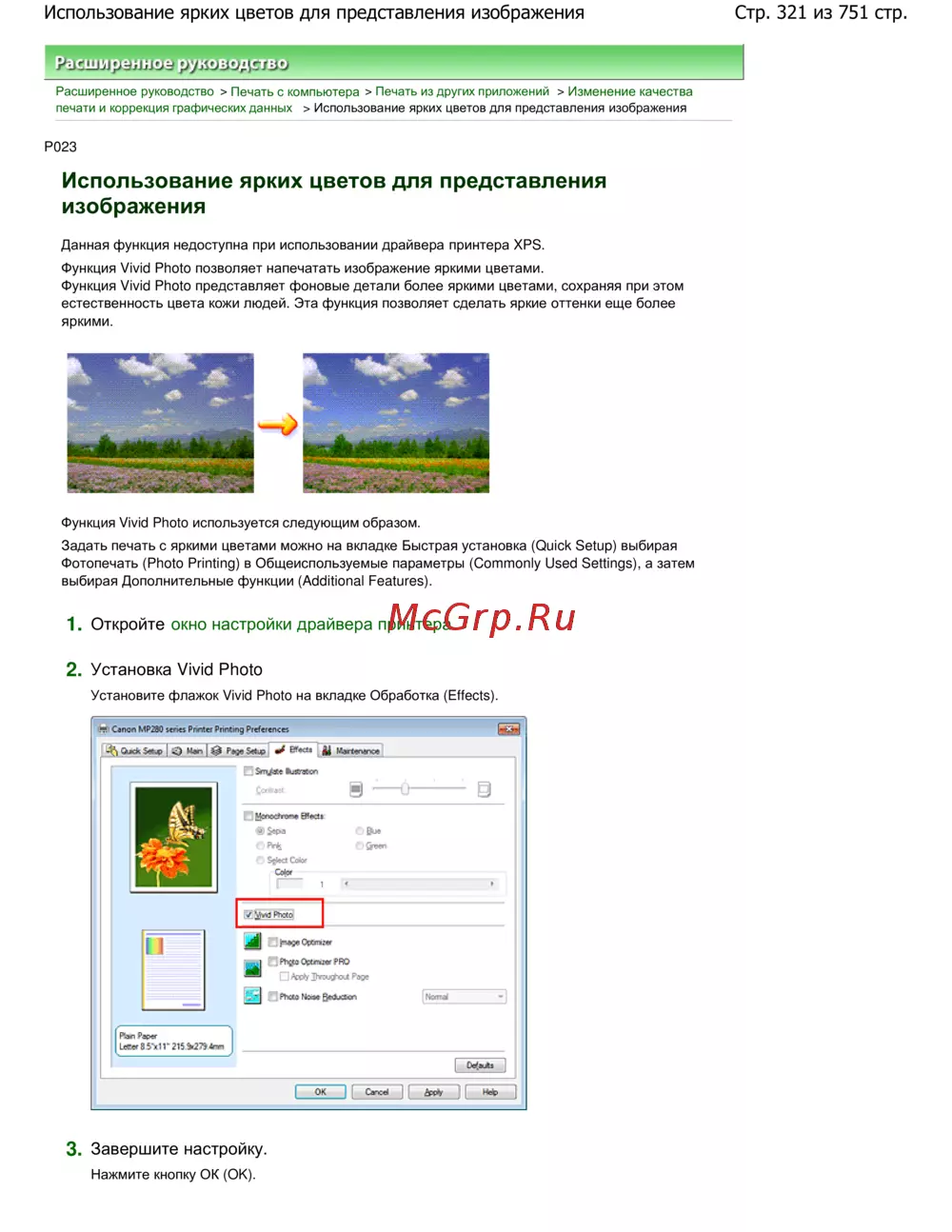 Функция Vivid Photo позволяет напечатать изображение яркими цветами.