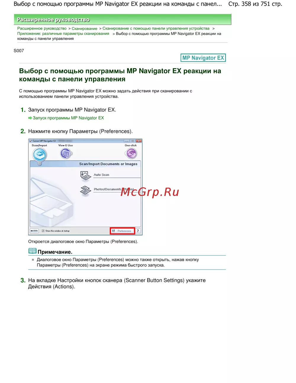 Стр. 358 из 751 стр.Выбор с помощью программы MP Navigator EX реакции на команды с панел...