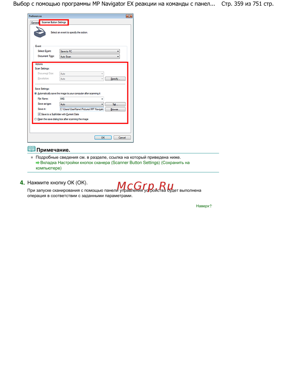 Стр. 359 из 751 стр.Выбор с помощью программы MP Navigator EX реакции на команды с панел...