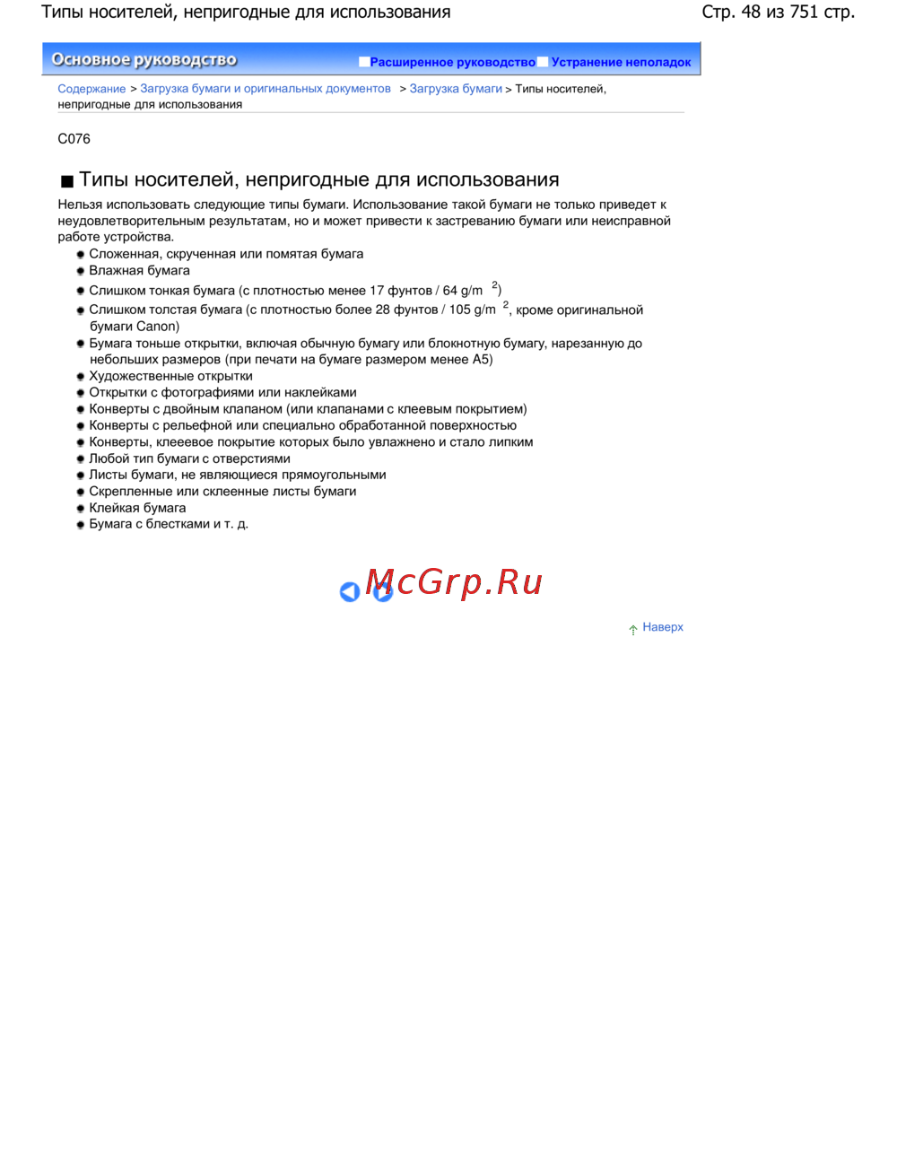 Canon Pixma MP280 — руководство по устранению неполадок: неподходящие типы бумаги [48/751]