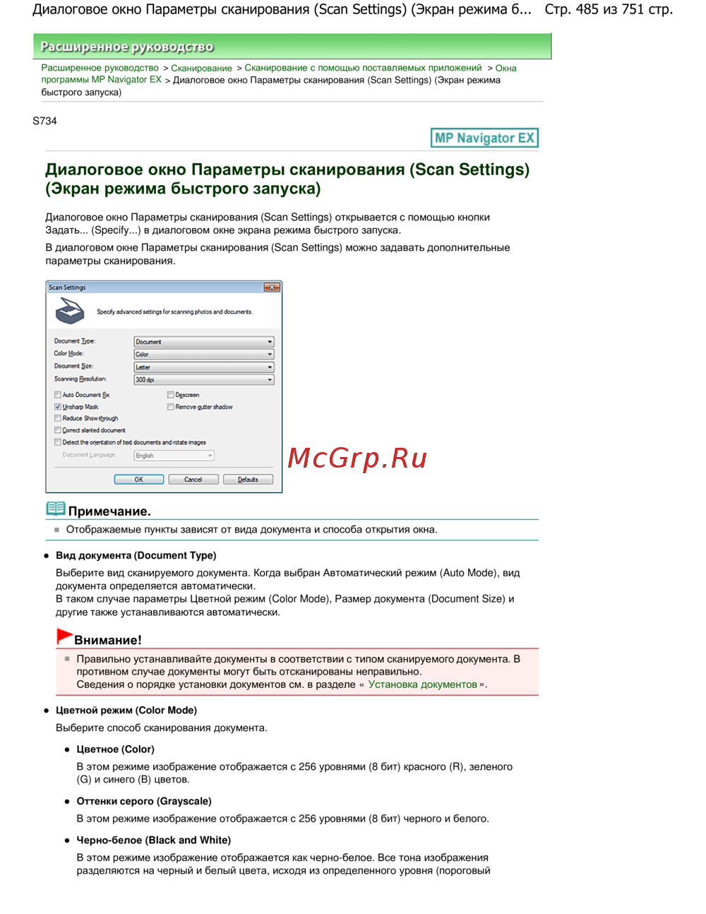 Стр. 485 из 751 стр.Диалоговое окно Параметры сканирования (Scan Settings) (Экран режима б...