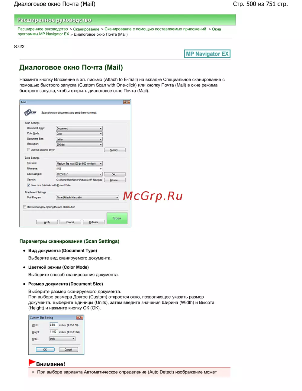 Узнайте, как использовать диалоговое окно Почта для сканирования документов. Настройте параметры сканирования, включая цветовой режим и размер документа.