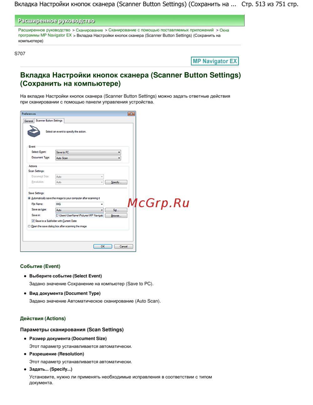 Стр. 513 из 751 стр.Вкладка Настройки кнопок сканера (Scanner Button Settings) (Сохранить на ...