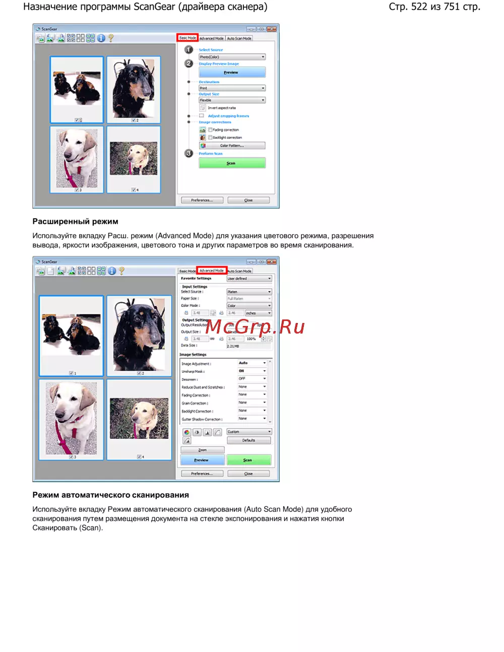 Стр. 522 из 751 стр.Назначение программы ScanGear (драйвера сканера)