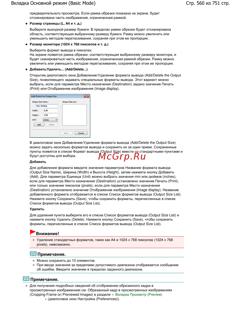 В диалоговом окне Добавление/Удаление формата вывода (Add/Delete the Output Size)