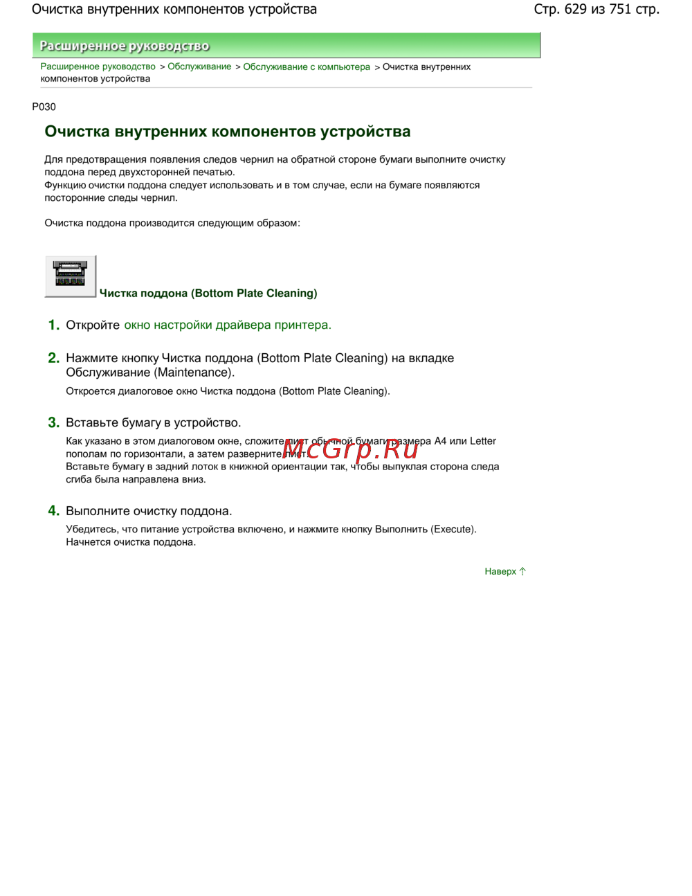 Нажмите кнопку Чистка поддона (Bottom Plate Cleaning) на вкладке