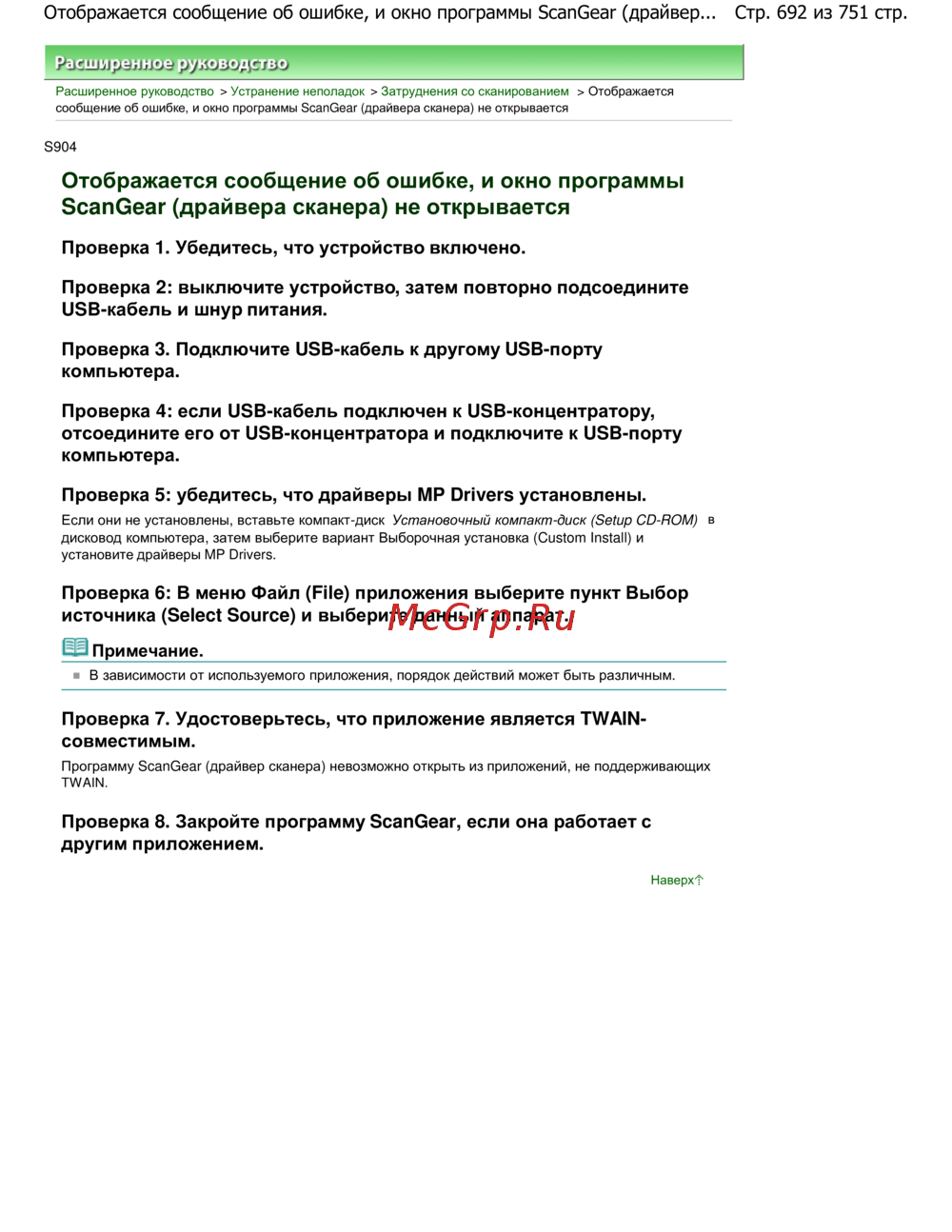 Стр. 692 из 751 стр.Отображается сообщение об ошибке, и окно программы ScanGear (драйвер...
