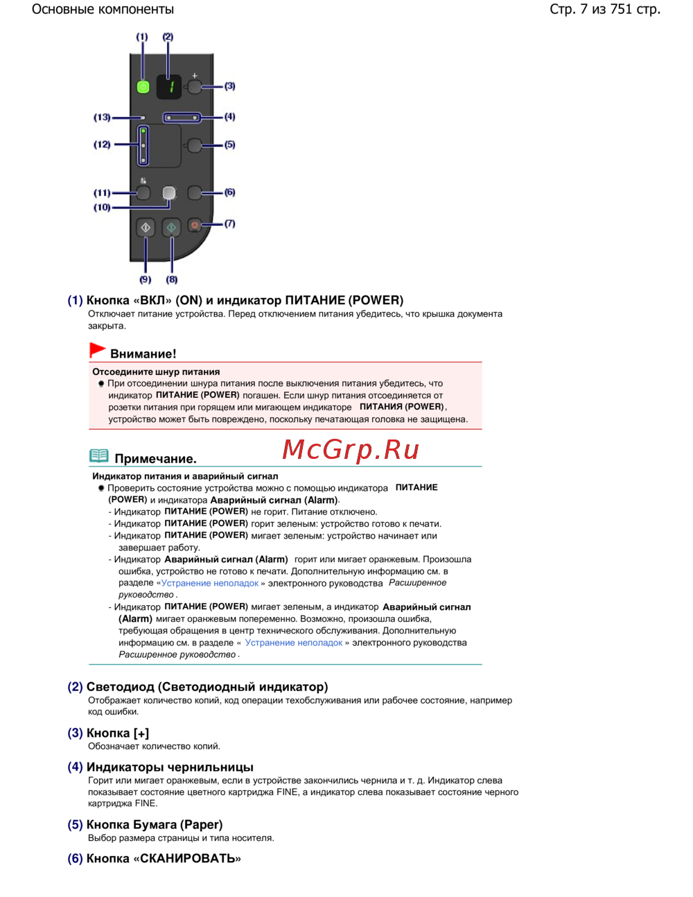 Canon Pixma MP280 — инструкция по использованию индикаторов и кнопок устройства [7/751]