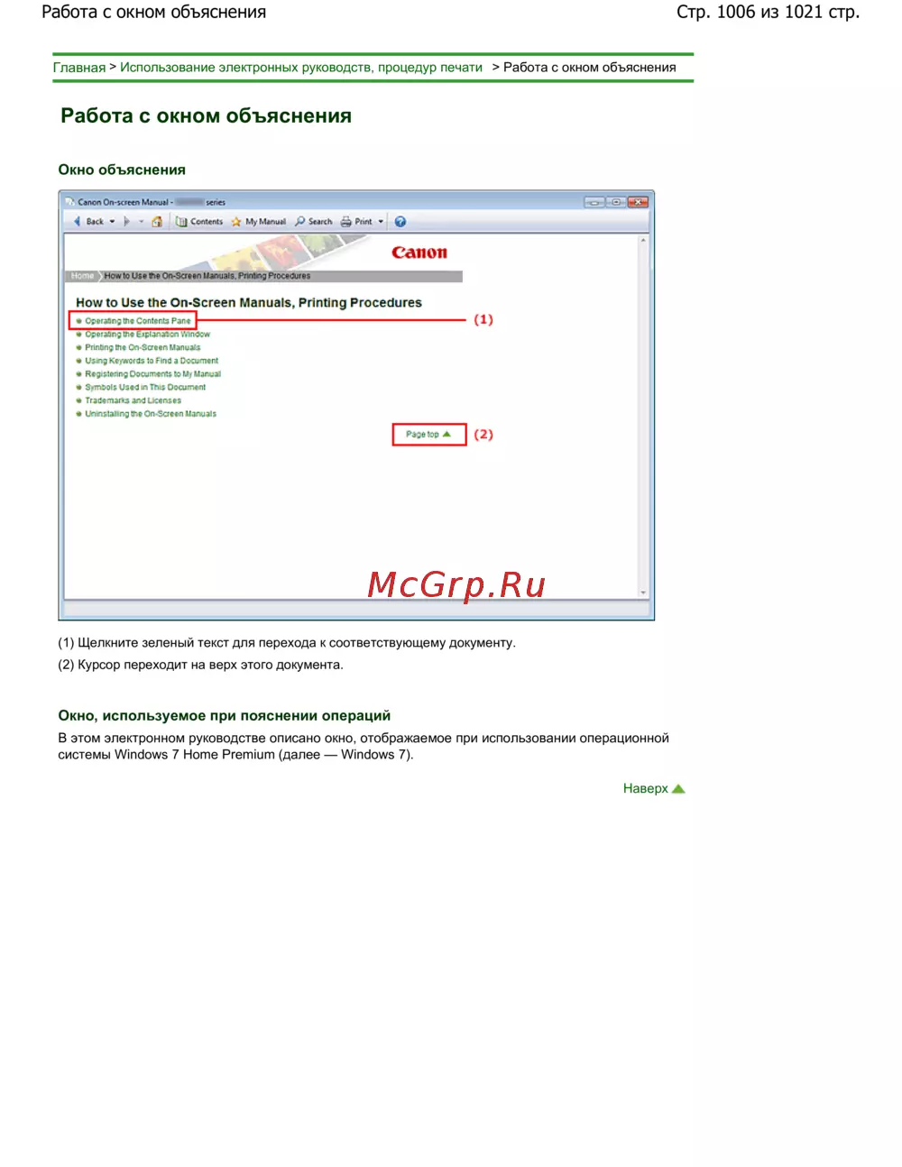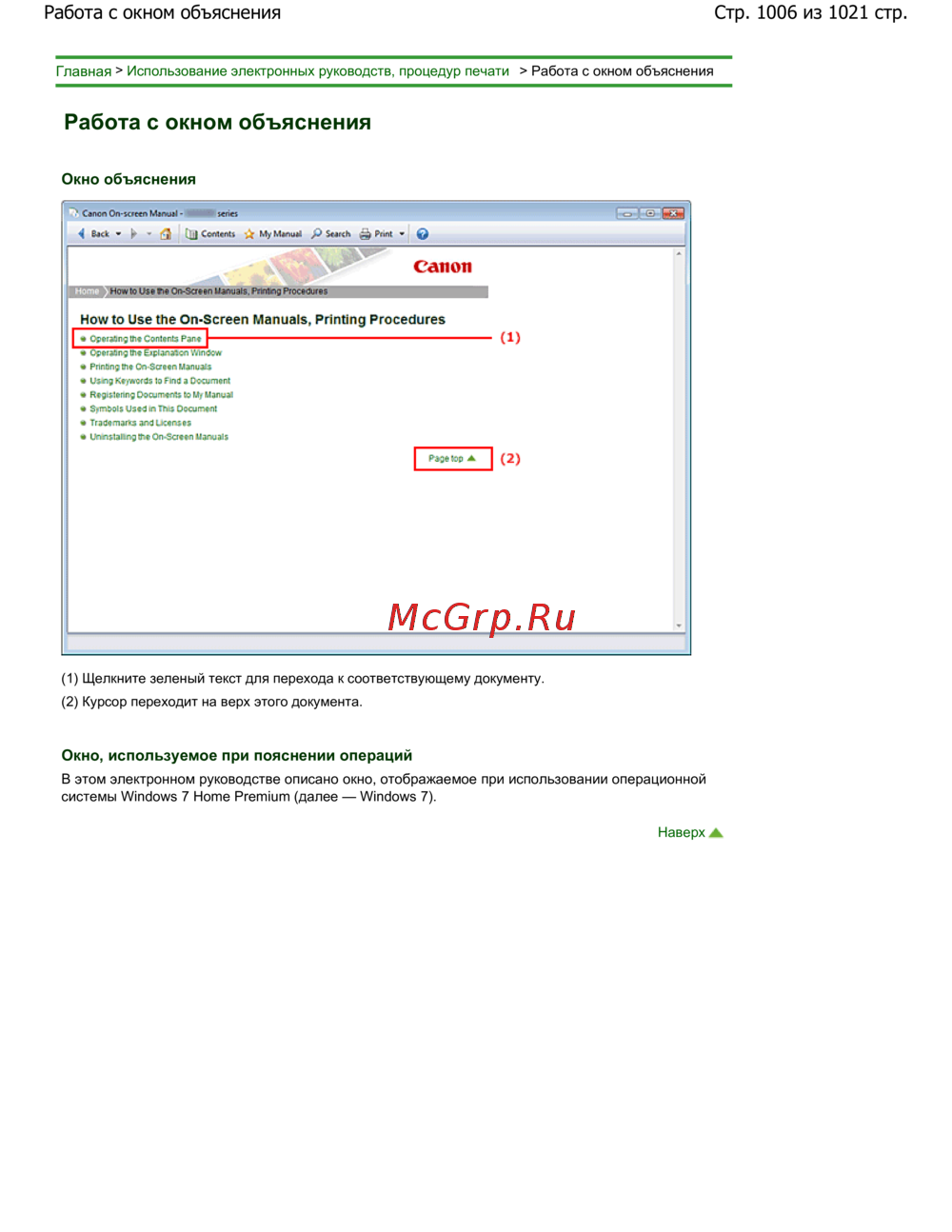Использование электронных руководств, процедур печати > Работа с окном объяснения