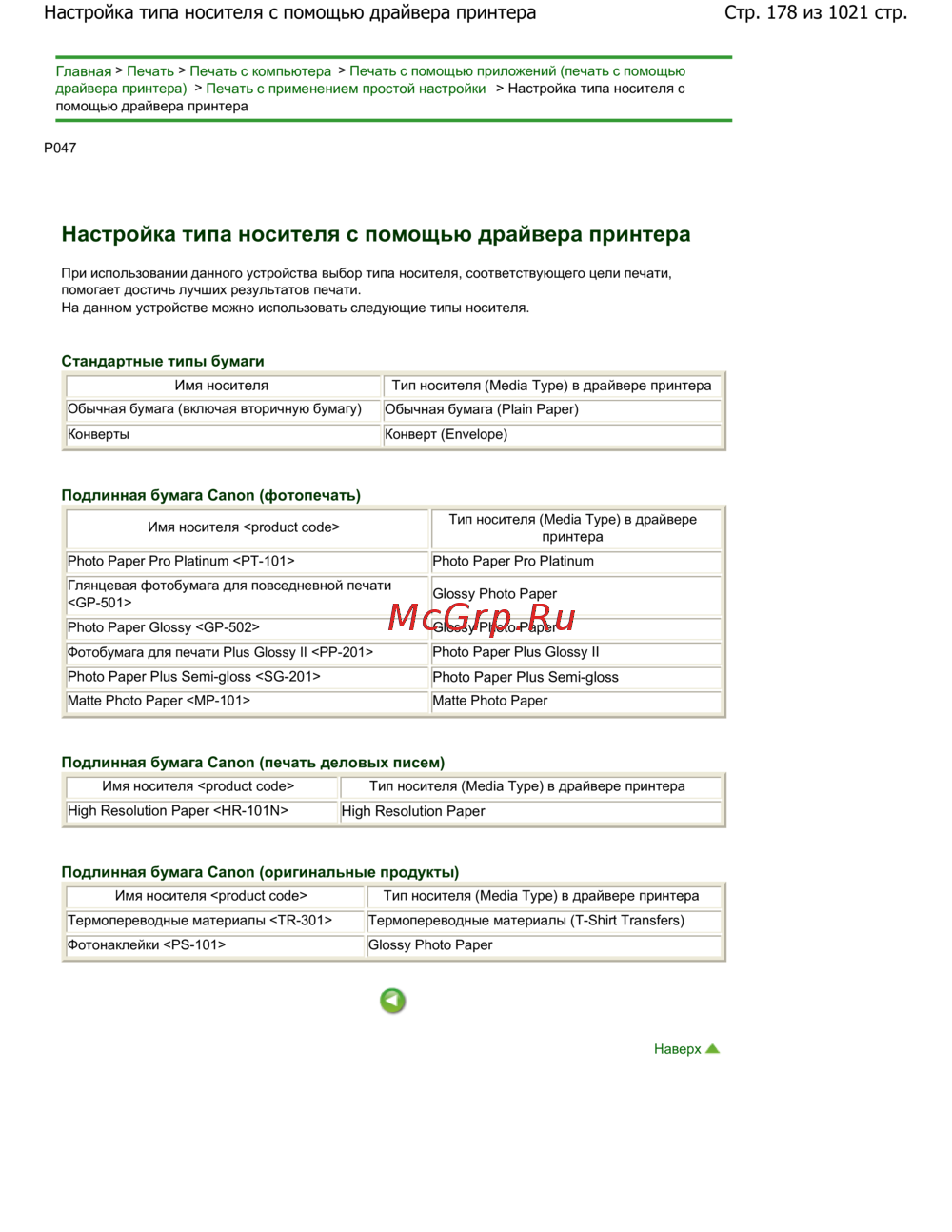 Стр. 178 из 1021 стр.Настройка типа носителя с помощью драйвера принтера