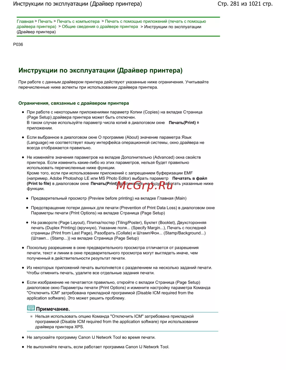 Canon Pixma MG4140 — инструкции по эксплуатации драйвера принтера: основные ограничения и рекомендации [281/1021]