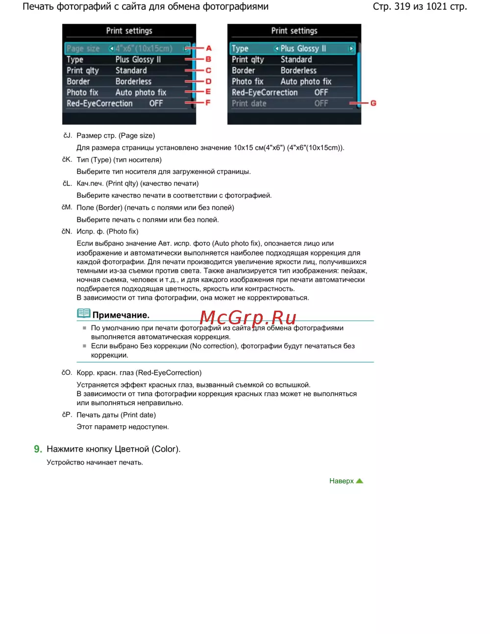Canon Pixma MG4140 — настройки печати фотографий: размер, качество и коррекция [319/1021]