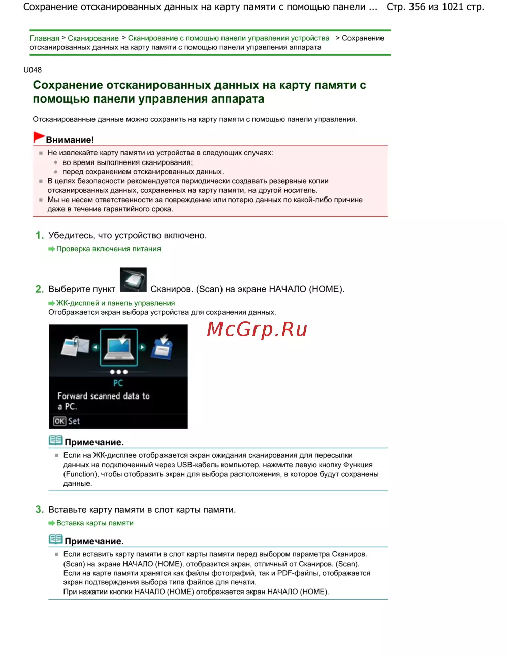 Стр. 356 из 1021 стр.Сохранение отсканированных данных на карту памяти с помощью панели ...