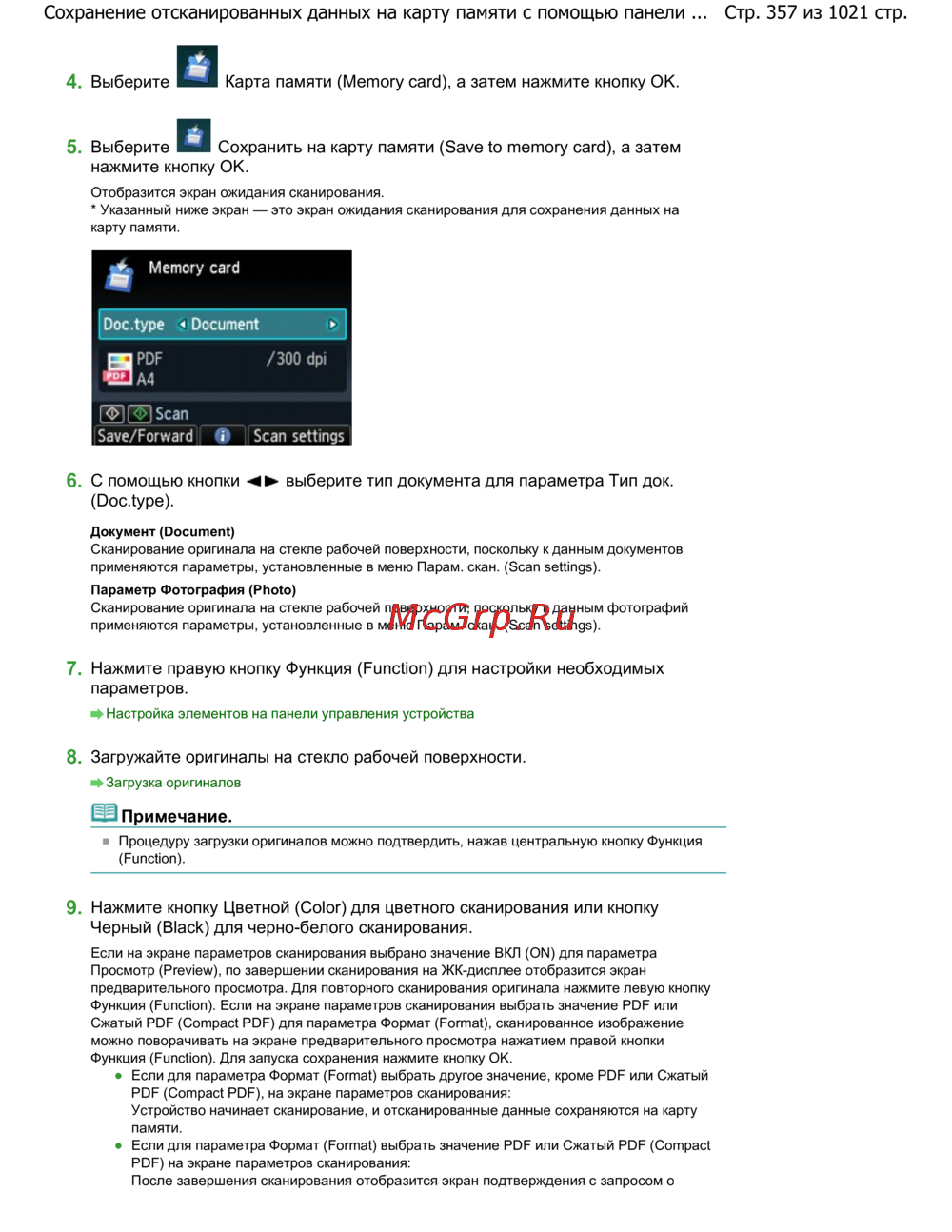 Стр. 357 из 1021 стр.Сохранение отсканированных данных на карту памяти с помощью панели ...