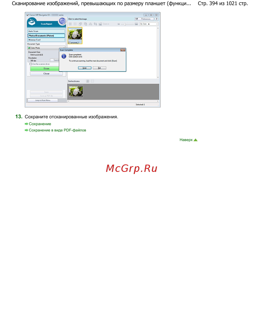 Стр. 394 из 1021 стр.Сканирование изображений, превышающих по размеру планшет (функци...