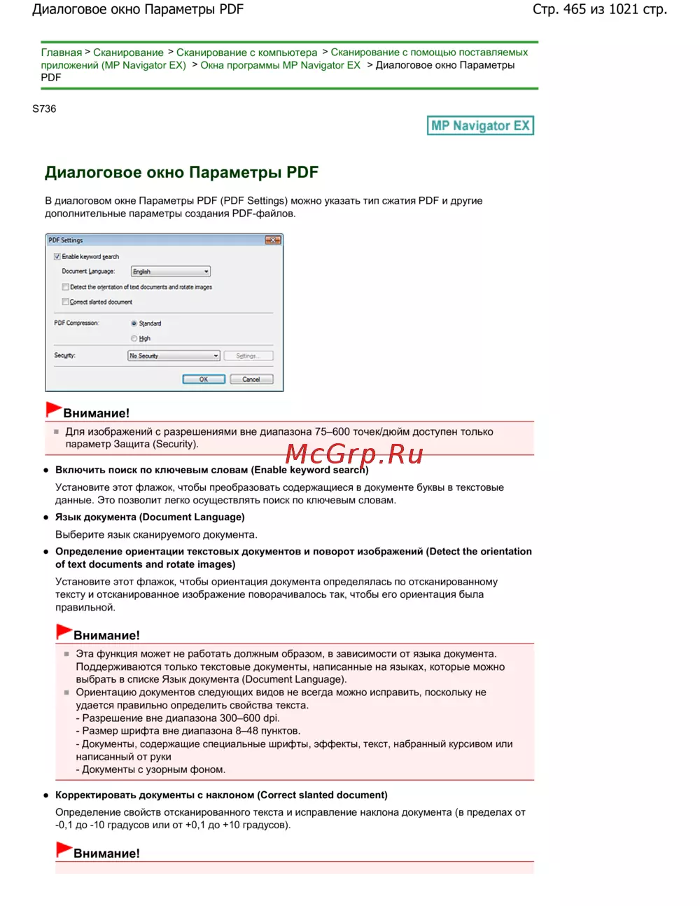 Стр. 465 из 1021 стр.Диалоговое окно Параметры PDF