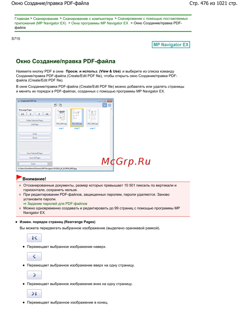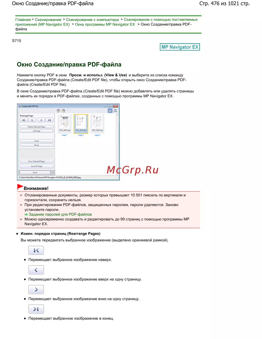 и менять их порядок в PDF-файлах, созданных с помощью программы MP Navigator EX.