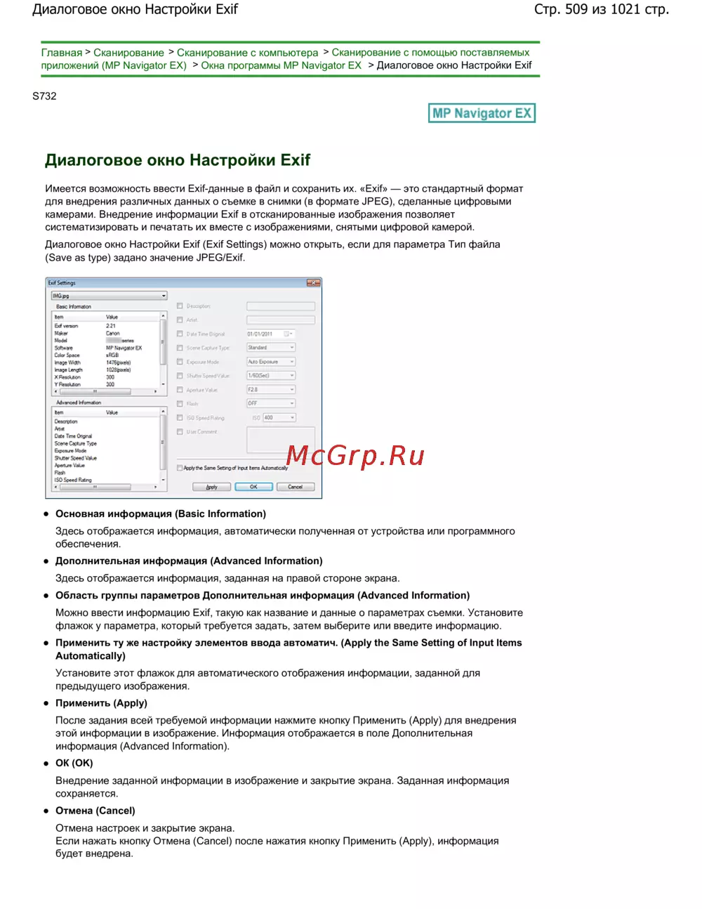 Стр. 509 из 1021 стр.Диалоговое окно Настройки Exif