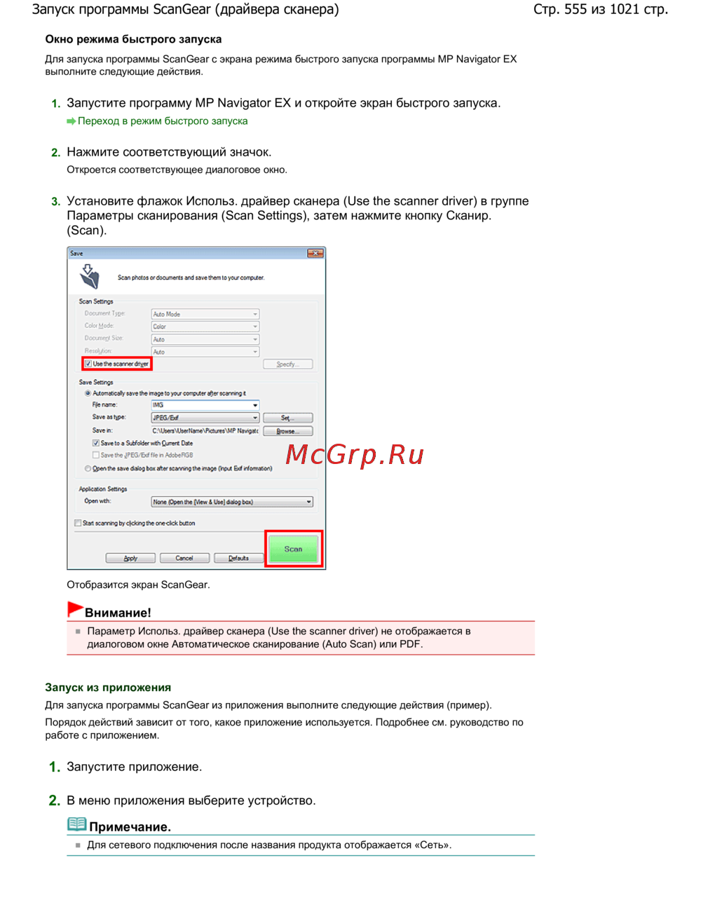 Стр. 555 из 1021 стр.Запуск программы ScanGear (драйвера сканера)