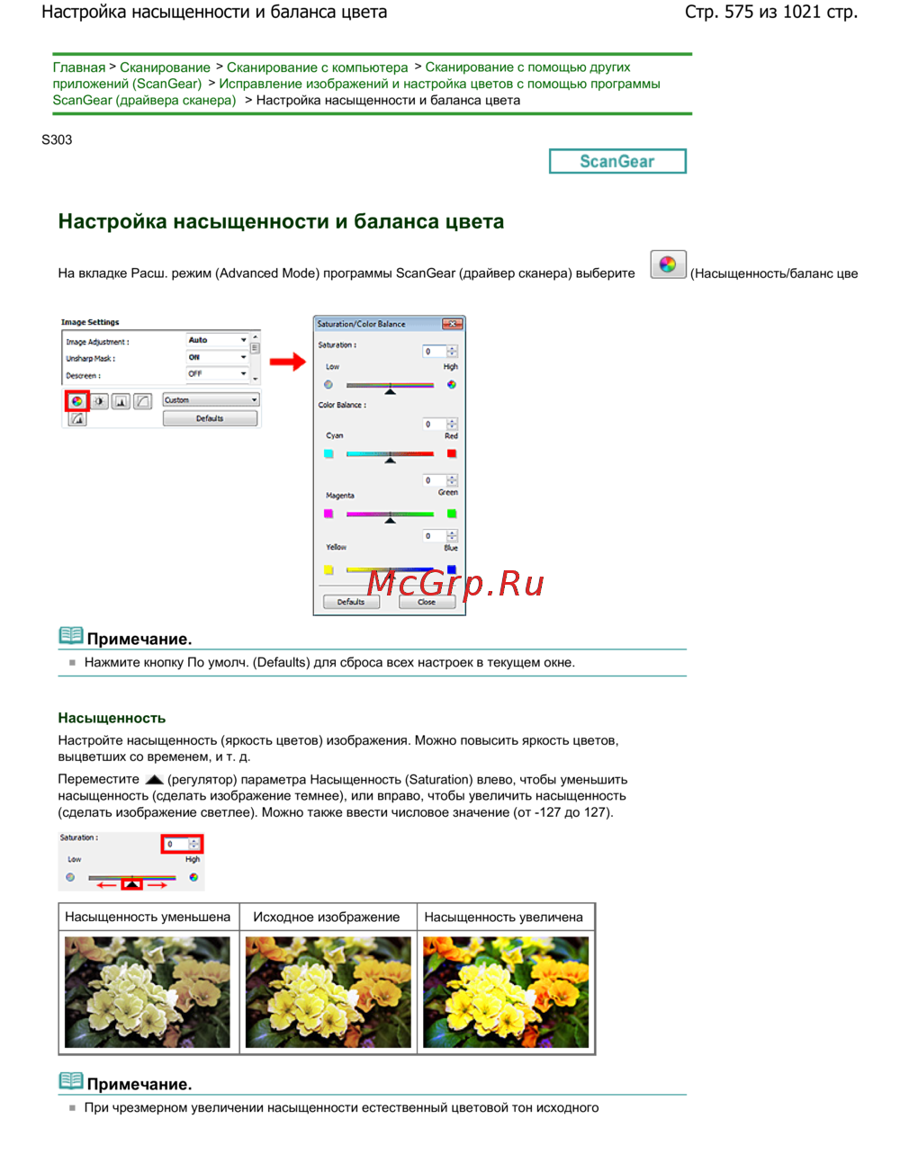 ScanGear (драйвера сканера) > Настройка насыщенности и баланса цвета