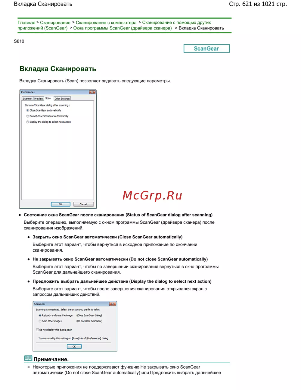 автоматически (Do not close ScanGear automatically) или Предложить выбрать дальнейшее