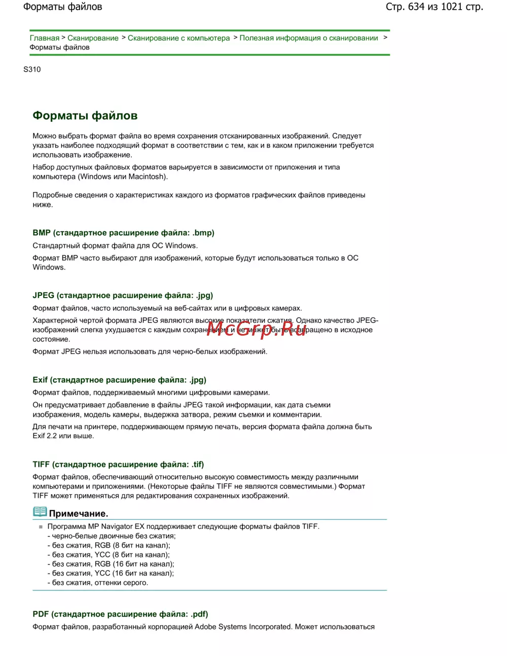 Программа MP Navigator EX поддерживает следующие форматы файлов TIFF.