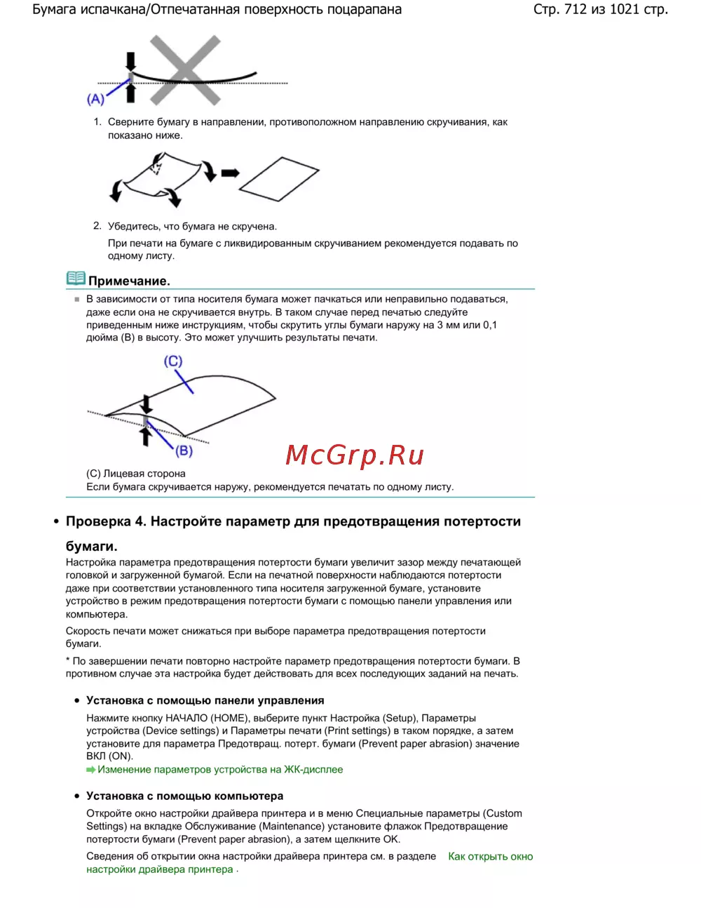 устройство в режим предотвращения потертости бумаги с помощью панели управления или