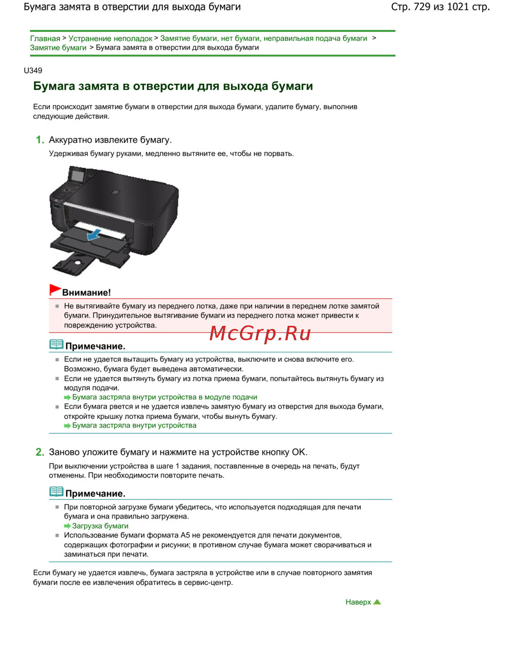 Стр. 729 из 1021 стр.Бумага замята в отверстии для выхода бумаги