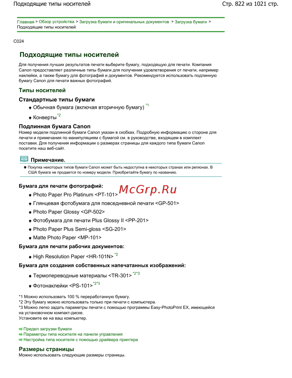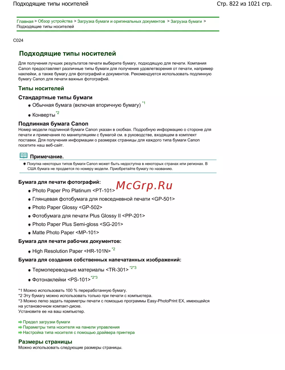 Номер модели подлинной бумаги Canon указан в скобках. Подробную информацию о стороне для